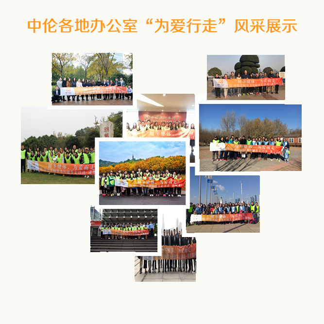 此前,中伦各地办公室曾在11月曾同步拉开”初冬健体,为爱而走”2017中伦健步走活动大幕,150余名中伦人走出办公室,用脚步丈量大自然的广阔,用目光记录沿途的风景。在为期一个月的活动结束后,所有中伦人行走的总步数将被兑换成相应金额的物资,送到需要帮助的孩子们手中,伴随他们走过这个暖心的冬天。
