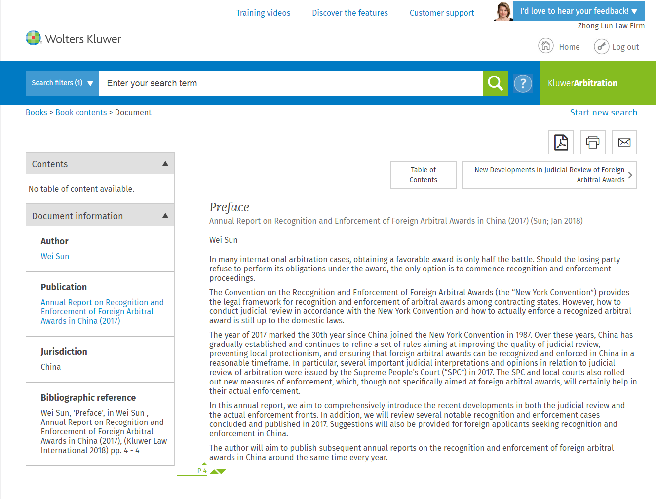 合伙人孙巍律师在威科国际商事仲裁在线发表2017年度中国法院承认与执行外国仲裁裁决年报