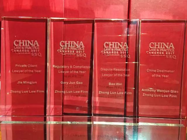 2017年9月14日,知名法律媒体《中国法律商务》(China Law & Practice)“2017年度法律大奖(China Law & Practice Awards 2017)”颁奖仪式在北京举行。中伦四位合伙人乔文骏、包伟、高俊及贾明军凭借卓越的执业能力、丰富的项目经验和优异的客户反馈,分别斩获“年度中国最佳交易律师(Dealmaker of the Year)”、“年度争议解决律师(Dispute Resolution Lawyer of the Year)”、“年度公司公司合规律师(Regulatory & Compliance Lawyer of the Year)”和“年度私人客户律师(Private Client Lawyer of the Year)”大奖。