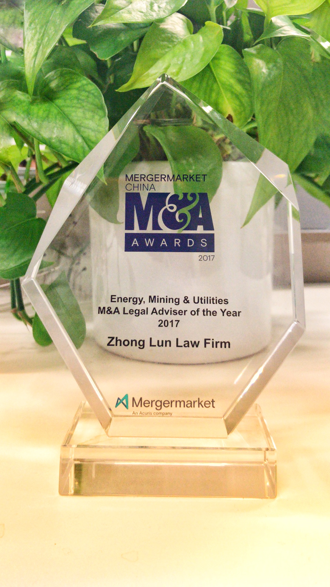 2017年10月19日,中伦律师事务所在Mergermarket 举办的首届中国企业并购论坛颁奖活动上,斩获“年度最佳能源、矿业和公共事业并购法律顾问(Energy, Mining & Utilities M&A Legal Adviser of the Year)”大奖。
