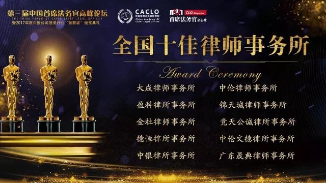 2017年11月18日,中伦律师事务所在青岛举行的第三届中国首席法务官高峰论坛暨2017年度中国公司法务行业“领航者”颁奖典礼中,荣耀摘得“2017年度中国十佳律师事务所”奖项。