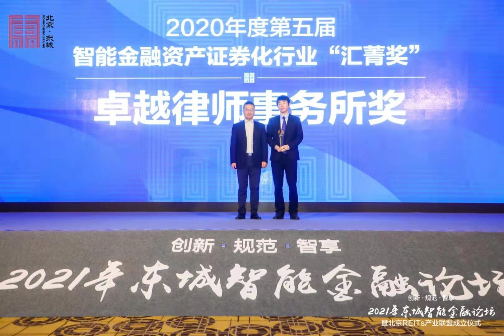 2021年3月27日,北京市东城2021年智能金融论坛暨北京REITs产业联盟成立仪式于北京丽晶酒店隆重举行,会上揭晓并颁发了第五届中国资产证券化行业“汇菁奖”。在本次评选中,中伦律师事务所荣获2020年度“卓越律师事务所奖”。同时,中伦律师事务所合伙人刘柏荣律师以其卓越的业务能力、丰富的实践经验以及广泛的客户认可,荣获“卓越贡献专家奖”。此外,由中伦律师事务所担任法律顾问的“兴银2020第二期疫情防控信贷资产支持证券、浦鑫归航2020年第二期不良资产支持证券、飞驰建普2020年第一期微小企业贷款资产支持证券、交诚2020年第一期不良资产支持证券、鲁能集团-中金公司-上海艾迪逊酒店资产支持专项计划、工银瑞投-中能建投风电绿色资产支持专项计划”荣获“杰出产品奖”, “平安证券-蒙牛乳业1期应收账款资产支持专项计划、中信证券-宇培集团仓储物流资产支持专项计划、金茂华福-重庆金茂珑悦资产支持专项计划”荣获“创新产品奖”。
