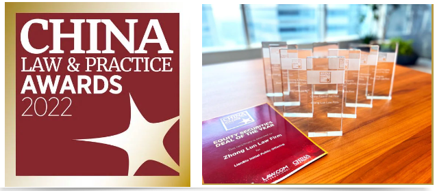 2022年9月8日,《中国法律商务》(China Law & Practice)“2022年度法律大奖”颁布,中伦斩获“年度中国律师事务所”大奖,并在银行及金融、争议解决、知识产权、并购和国际贸易五个领域荣获“年度杰出律师事务所”奖项。中伦承办的“联拓生物首次公开募股”项目获评“年度杰出股权融资交易”,中伦合伙人程军律师、顾萍律师分别获评“年度杰出交易律师”和“年度杰出知识产权律师”。