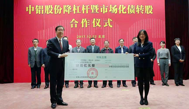 日前,中国人寿保险股份有限公司(纽约证券交易所(股票代码:LFC)、香港联合交易所(股票代码:02628)和上海证券交易所(股票代码:601628),以下简称“中国人寿”)与华融瑞通股权投资管理有限公司等8家投资者通过“债权直接转为股权”和“现金增资偿还债务”两种方式对中国铝业股份有限公司(纽约证券交易所(股票代码:ACH)、香港联合交易所(股票代码:02600)和上海证券交易所(股票代码:601600)三地挂牌上市之上市公司,以下简称“中国铝业”)所属4家全资子公司合计增资人民币126亿元(其中,中国人寿增资人民币40亿元),实施市场化债转股。