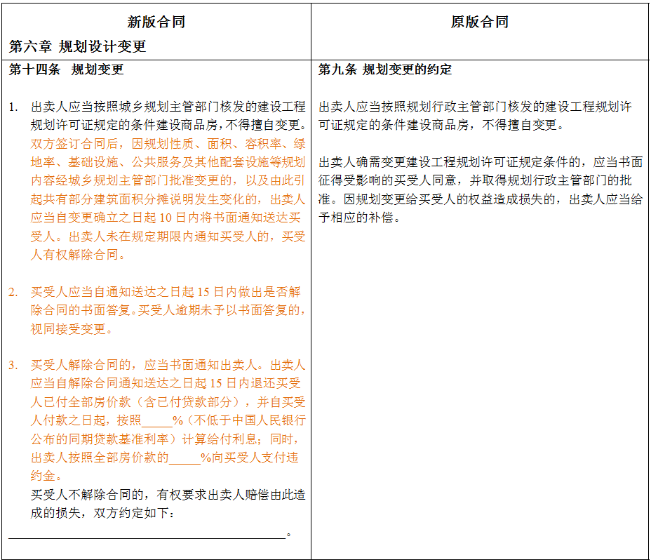 新增内容:规划变更前出卖人的义务,约定涉及商品房规划用途、面积、容积率、绿化率、基础设施设备、公共服务及其他配套设施等规划许可内容变更的须经规划行政主管部门批准,且出卖人应当书面通知买受人,买受人有权解除合同或要求赔偿损失。