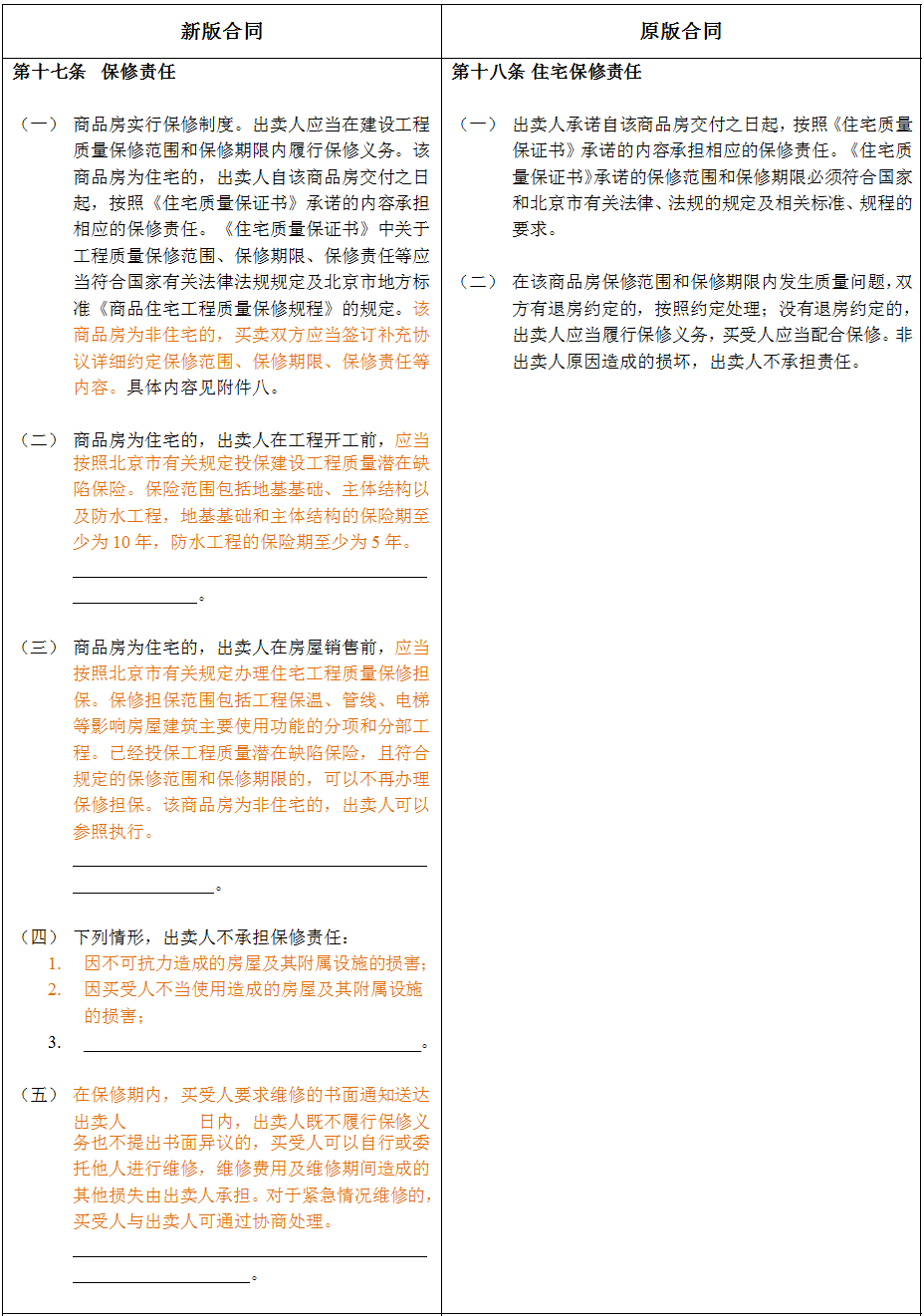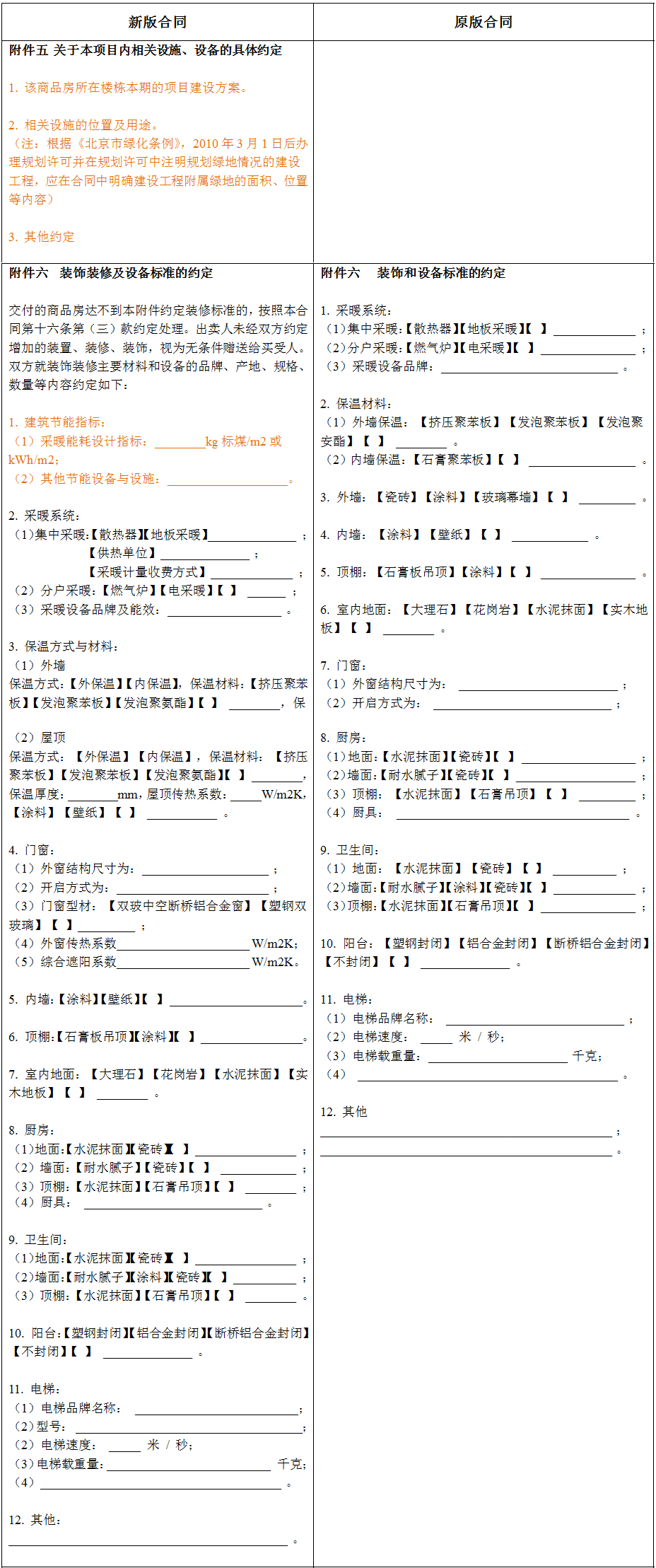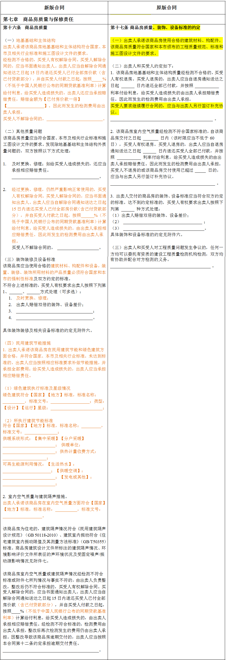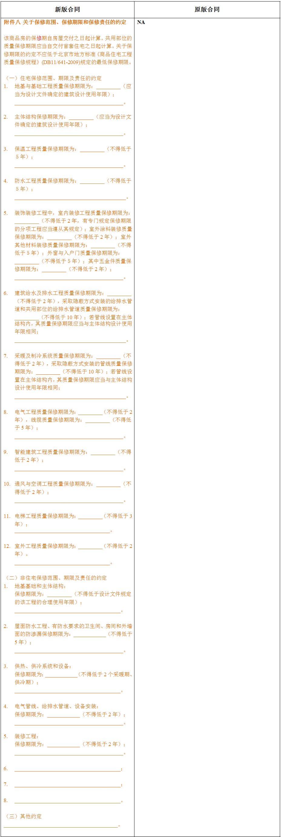 该修改与本次修订强调出卖人提示义务的精神一致,要求双方在附件中明确相应设施设备的保修期限及范围,并就法律法规及建筑规范直接明确的最低保修期限和范围进行了提示。