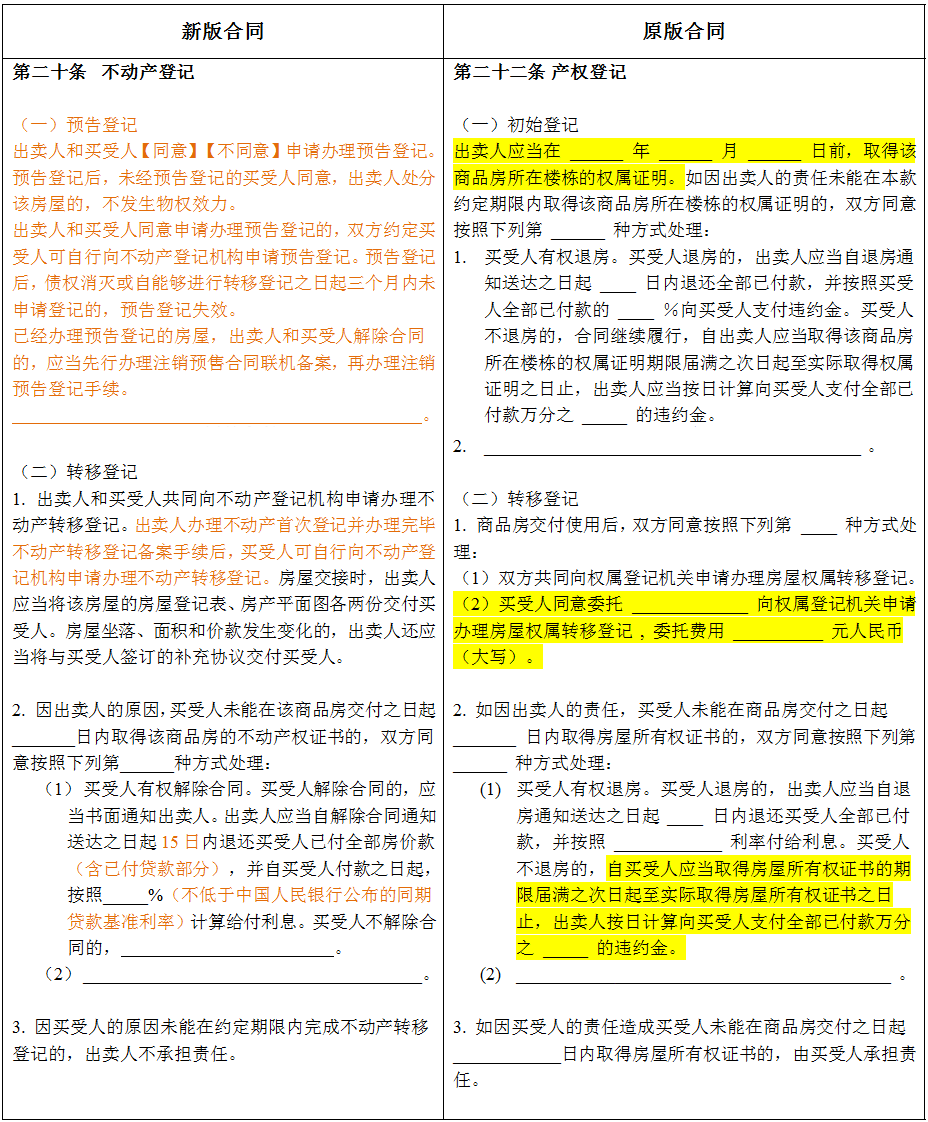 根据《物权法》、《不动产登记暂行条例》的有关规定,增加“预告登记”的相关约定,对买受人进行此项权利的提示,增加了“出卖人办理不动产首次登记并办理完毕不动产转移登记备案手续,买受人可自行向不动产登记机构申请办理不动产转移登记”的约定,有利于区分买卖双方对于逾期办证的违约责任。