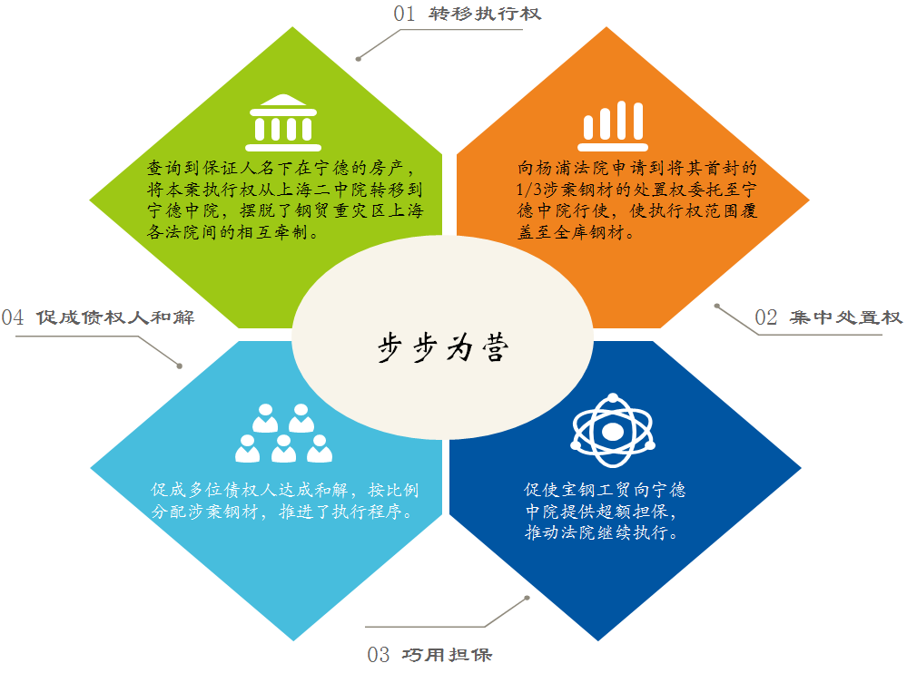 2014年底,本所受聘介入本案后,重新梳理了永驻仓储涉诉、涉执行的整体情况以及各案的具体进展情况和障碍,以求寻得突破口。同时,我们也对永驻仓储及担保人展开了全面的财产调查。经分析,我们认为本案最大的障碍在于多家执行法院的互相牵制和阻碍。因此我们需要重点寻找多起案件的连接点,集中执行权,并将执行权范围覆盖至全库钢材。我们同时试图将执行权转移至其他非钢贸重灾地区法院,以摆脱原执行法院之间的相互牵制,确保统一执行。