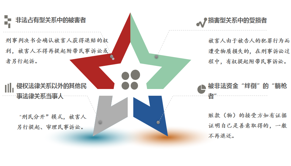 1. 对于非法占有型的经济犯罪,采用“刑民合一”的违法所得追缴模式。追缴违法所得发还被害人的,被害人不能再提起附带民事诉讼或者另行起诉。