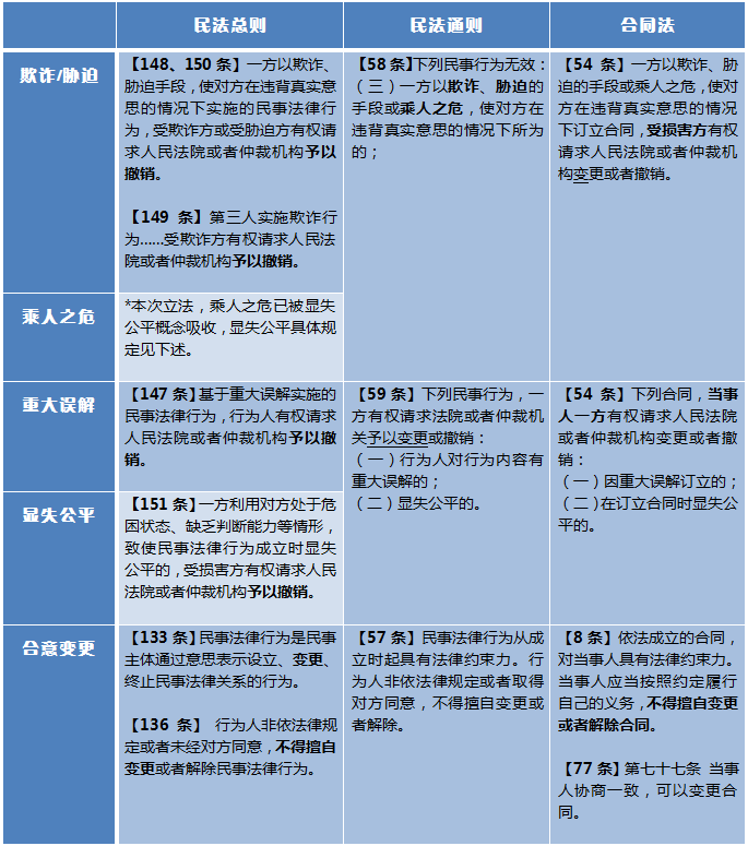 现代民法理论认为,民事法律行为既根植私法自治原则且以意思表示为要素,则法律行为的生效要件之一应为意思表示健全——亦即(1)民事主体内在意思和外在表示应一致且(2)该等意思表示发端自愿,否则,便存在意思表示瑕疵,从而导致民事法律行为的效力瑕疵。因循传统大陆法系民法理论,我国民事立法体例意在将意思表示不自由(欺诈、胁迫、乘人之危、显失公平(尾注1))和意思与表示不一致(重大误解)纳入意思表示瑕疵范畴。在《总则》制定前,基于《通则》和《合同法》规定,该等瑕疵可通过赋予当事人撤销和变更两种权利予以纠正,但刚刚通过的《总则》删除了“可变更”规定。新、旧法具体差异如下: