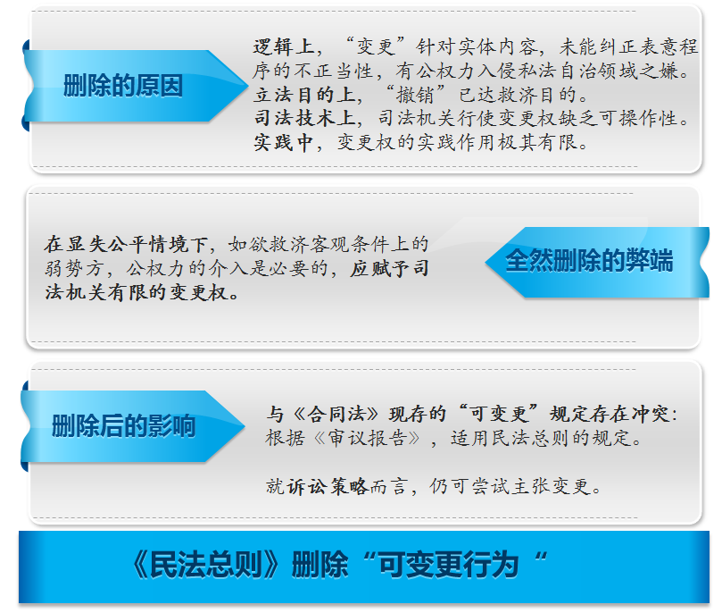 本次删除“可变更”规定,仅保留当事人的撤销权,参见梁慧星教授的分析(尾注2),究其概因,我们认为有合理性。
