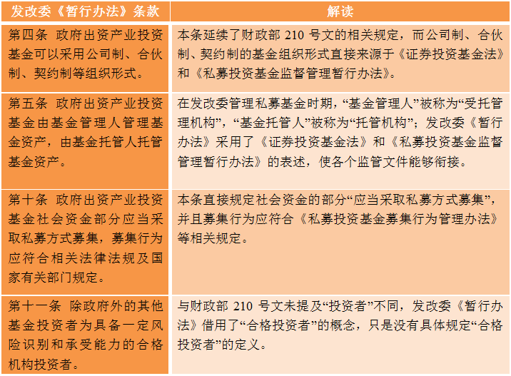 发改委《暂行办法》及财政部210号文,规制的都是“有政府出资的基金”。只是财政部210号文侧重于政府出资资金的预算管理、政府投资收益管理、政府投资的退出、政府投资资产的会计核算;而发改委《暂行办法》更侧重于建立基金监管体系、绩效评价、信用建设等。