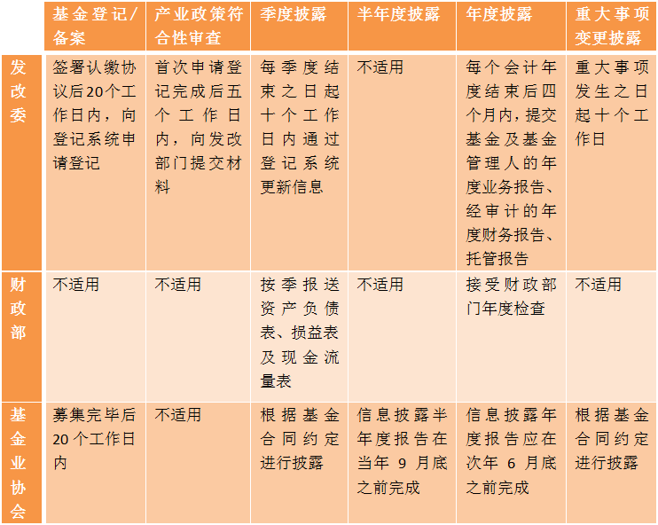 如前所述,作为政府出资与采用私募方式募集社会资本形成的基金,其基金管理人除了要行使基金合同赋予的管理职责外,还要承担来自于发改委、财政部及基金业协会规定的登记/备案责任和持续信息披露责任,具体如下: