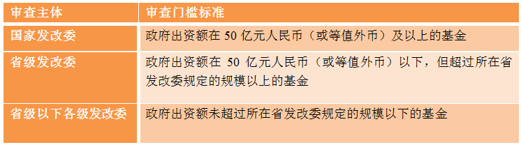 根据发改委《暂行办法》及《登记指引》相关规定,产业基金在信用信息登记系统首次申请登记完成后五个工作日内,由发展改革部门根据登记信息及相关书面材料,在三十个工作日内对基金投向进行产业政策符合性审查,并在信用信息登记系统予以公开。国家发改委与地方发改委的审查权限分工如下: