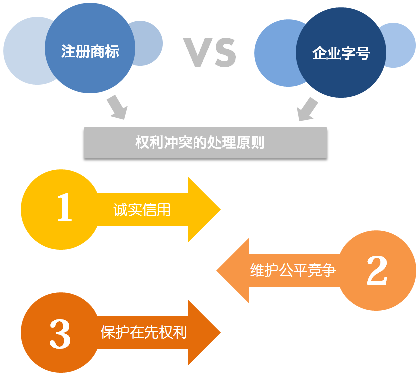 因而,注册商标与企业字号,本质上属于平等的两项权利,并注册商标并不当然优先于企业字号,企业字号也并不当然优先于注册商标。当两者发生权利冲突时,法院原则上根据“诚实信用、维护公平竞争和保护在先权利”三大原则予以处理。