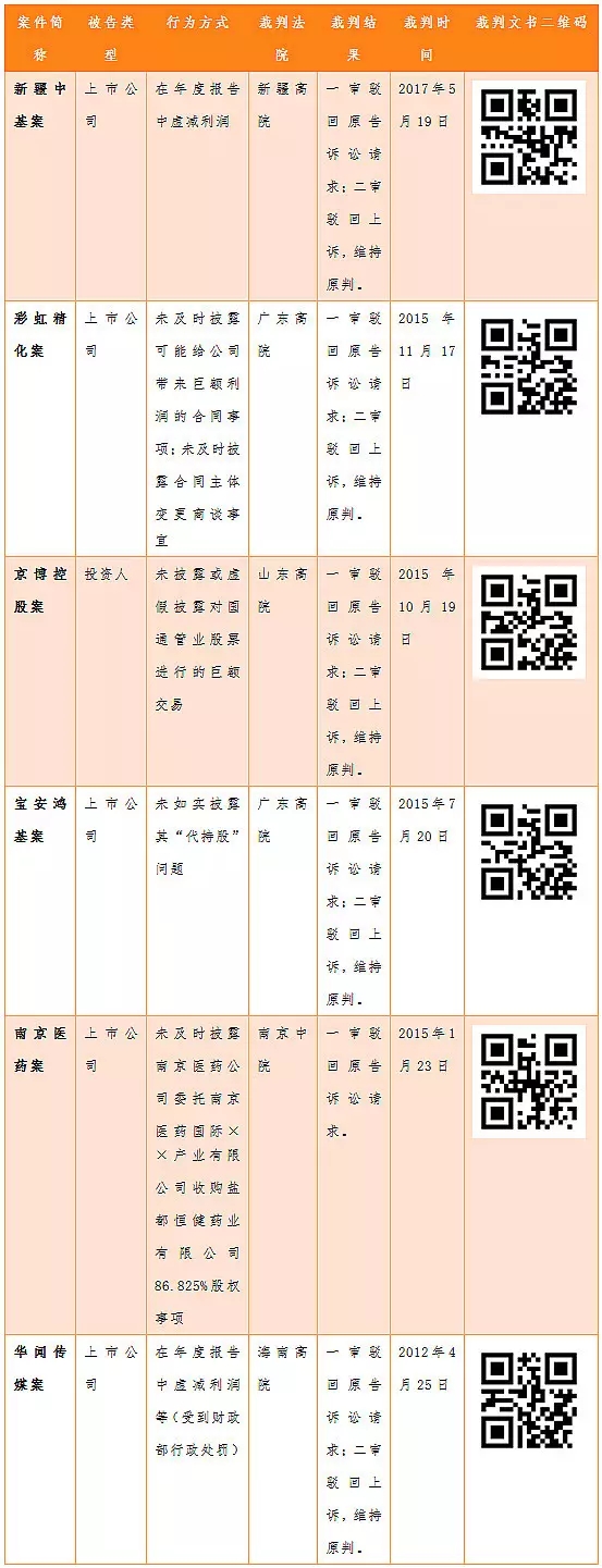 通过检索中国裁判文书网等常用法律数据库,我们发现,“证券虚假陈述责任纠纷”这一案由下的绝大多数案例均由诱多型虚假陈述引发,然而,近几年来也出现了一些因诱空型虚假陈述引起的纠纷案件。虽然仅有为数不多的案件,但是这些案件所呈现出的不同事实形态,以及不同的法院处理该类纠纷的不同思路,成为帮助我们研究该类案件实务状况的珍贵研究素材。我们以表格的形式对其中的典型案例进行简要展示,后续将结合本文讨论的需要进行详细分析。