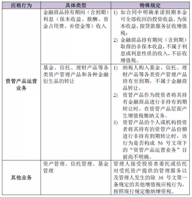 在此之前,2016年3月23日,财政部和国家税务总局颁布《关于全面推开营业税改征增值税试点的通知》(财税[2016]36号,以下简称“36号文”),规定了金融行业由缴纳营业税改为增值税。2016年12月,财政部和国家税务总局颁布了《关于明确金融、房地产开发、教育辅助服务等增值税政策的通知》(财[2016]140号,以下简称“140号文”),规定了资管产品运营过程中发生的增值税应税行为,以资管产品管理人为增值税纳税人。