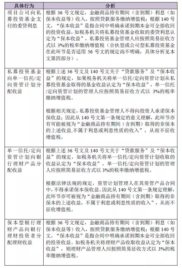 我们理解,在此交易架构下,项目公司向私募股权投资基金分配的投资收益,在不具备明股实债等可能被税务机关认定为“保本收益”的安排前提下,不具有“贷款服务”或“保本收益”的性质,私募投资基金管理人应无须就前述股权收益缴纳增值税;相应地,如与前述安排一致,则私募投资基金向单一信托/定向资管计划、单一信托/定向资管计划向银行理财分配收益、理财产品管理人向理财投资者分配收益,也可被认为不属于增值税应税行为。