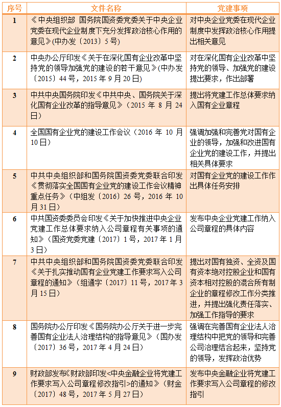 中共国资委委员会于2017年1月3日印发《关于加快推进中央企业党建工作总体要求纳入公司章程有关事项的通知》(国资党委党建〔2017〕1号),财政部于2017年5月27日发布《财政部印发<中央金融企业将党建工作要求写入公司章程修改指引>的通知》(财金〔2017〕48号),以指导国有企业的章程修改,具体内容归纳如下: