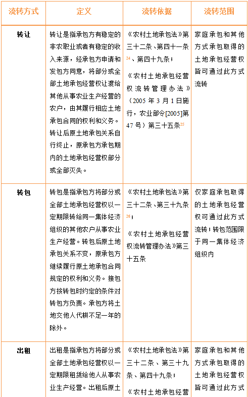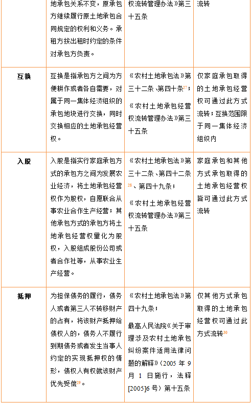 [25] 《农村土地承包经营权流转管理办法》第三十五条规定了农村土地承包经营权的转让、转包、互换、入股和出租的基本概念,其条款内容已分别摘录至本表“定义”项下。