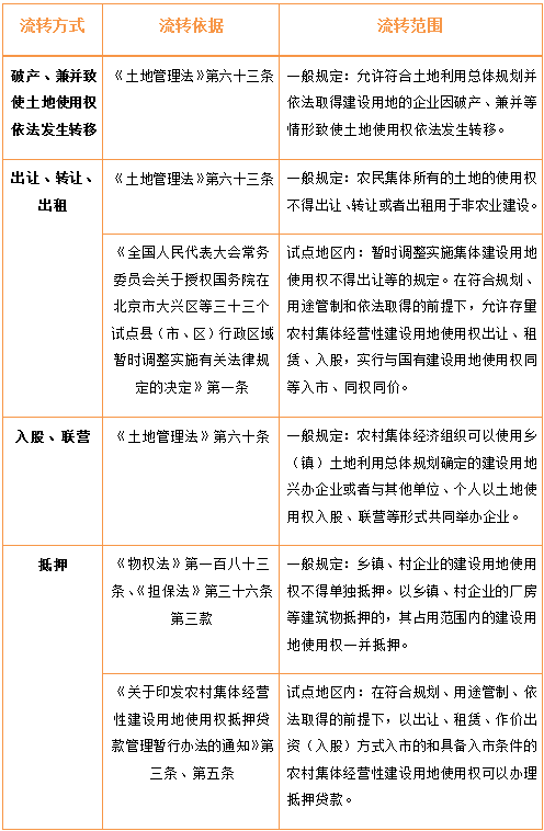 综上,我们将现行法律及政策中对集体建设用地使用权流转方式的规定总结如下: