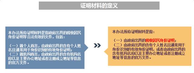 《管理办法》正式版本进一步完善了征求意见稿中对证明材料的定义,厘清了不同证明材料间的逻辑关系,即政府出具的税收居民身份证明与政府出具的有效身份证明(个人)、官方文件(机构)皆可作为证明材料,二者为并列关系,并非包含关系。