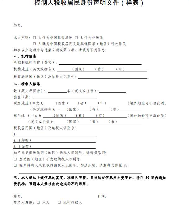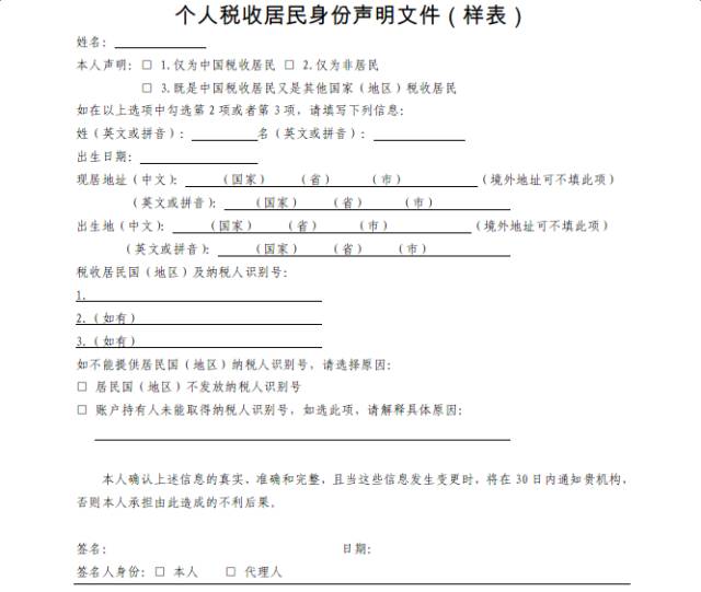 为此,管理人至少需要在基金认购签约文件中加入《个人税收居民身份声明文件》、《机构税收居民身份声明文件》、《控制人税收居民身份声明文件》等为履行非居民金融账户涉税信息尽职调查所要求的相关文件。以下声明文件表格仅供参考,各基金管理人可以在此基础上进行修改完善,制定符合自身业务需要的声明文件,或者与本机构其他业务文件进行整合,只要能够体现出下列表格中的相关信息即可。