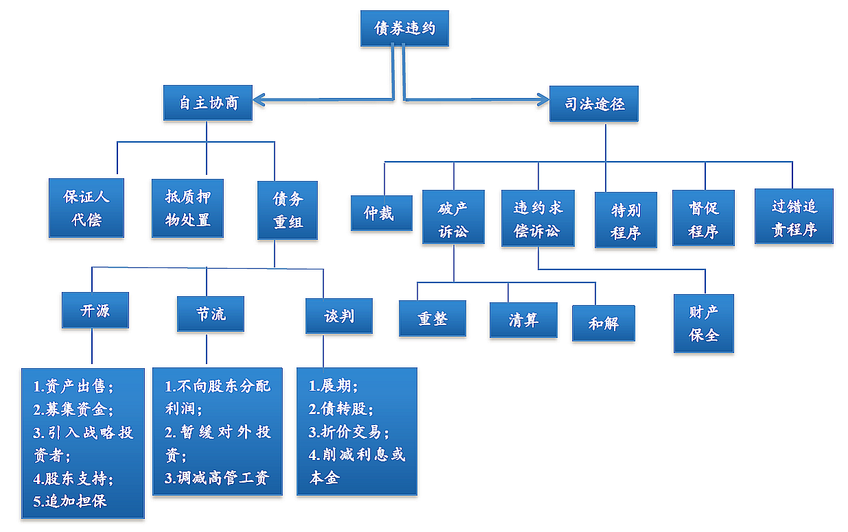 就既有债券违约的处置情况来看,常用的争议解决途径主要有自主协商、违约求偿诉讼和破产程序。