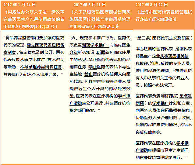 在《办法》出台之前,13号文明确要求建立医药代表备案制度,明确医药代表应当从事学术推广活动,不得承担药品销售任务;国家食品药品监督管理总局(CFDA)于今年五月份出台的《关于鼓励药品医疗器械创新实施药品医疗器械全生命周期管理的相关政策(征求意见稿)》(以下简称“《鼓励政策》”),则对医药代表的职能做出了“一听一介绍三禁止”的要求。上海《办法》在医药代表职能上,因袭国家政策,将医药代表的职能明确为药品信息的传递、沟通、反馈(即进一步明确学术推广的外延)。