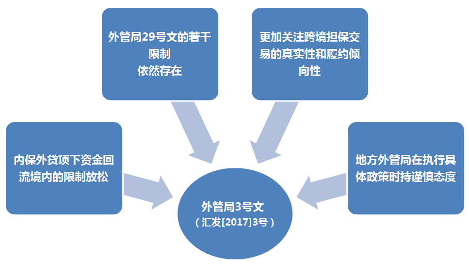 3号文放开了通过向境内放贷和股权投资的方式将担保项下资金直接或间接调回境内使用的限制。根据3号文以及其他相关法规,境内借用资金的机构在符合现行外债管理的相关要求的情况下,可以按照相关规定办理外债登记;若境外债务人用内保外贷项下资金向境内机构进行股权投资,应当满足相关主管部门对外商直接投资的管理规定。此外,根据外管局于2017年4月27日发布的《<国家外汇管理局关于进一步推进外汇管理改革完善真实合规性审核的通知>的政策问答》(第二期)(“《政策问答(第二期)》”)的说明,上述29号文中明确列举的四类直接或间接股权、债权投资回流限制不再适用。可见,随着3号文的出台,在法规层面上,内保外贷项下资金回流境内的限制得到了很大程度的放松。