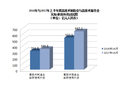 近年来,外商投资的行业领域也在发生重大变化,从传统的低端制造业为主,逐步进入到高端制造业(例如半导体、医药等高新技术产业)、人工智能、虚拟现实、互联网+等新经济行业。根据商务部统计数据,2017年1-6月,高技术制造业实际使用外资349.7亿元人民币,同比增长11.1%,其中,计算机及办公设备制造业、航空、航天器及设备制造业,以及医药制造业实际使用外资同比分别增长178.9%、149.4%和10.3%。高技术服务业实际使用外资647.2亿元人民币,同比增长20.4%。其中,信息技术服务、研发与设计服务、科技成果转化服务实际使用外资同比分别增长35.6%、13.9%和46.3%。