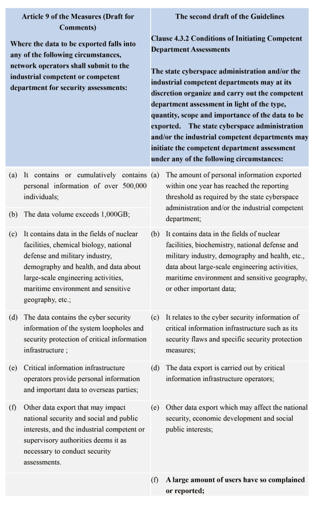In addition to having respectively clarified the process of self-assessment and competent department assessment, the second draft of the Guidelines has enumerated the conditions upon which security self-assessments and competent department assessments will be initiated, and the circumstances in which self-assessment reports shall be submitted to the state cyberspace administration and/or the industrial competent departments. It is worth noting that the Measures has also enumerated the circumstances in which network operators shall apply to the industrial competent or supervisory departments to organize security assessments. Compared with the Measures, the second draft of the Guidelines has added two more conditions upon which competent department assessments will be initiated: (1) a large amount of users have so complained or reported; or (2) national industry associations have so recommended. These two conditions may increase the feasibility for competent departments to initiate security assessments in response to the feedbacks of the public.