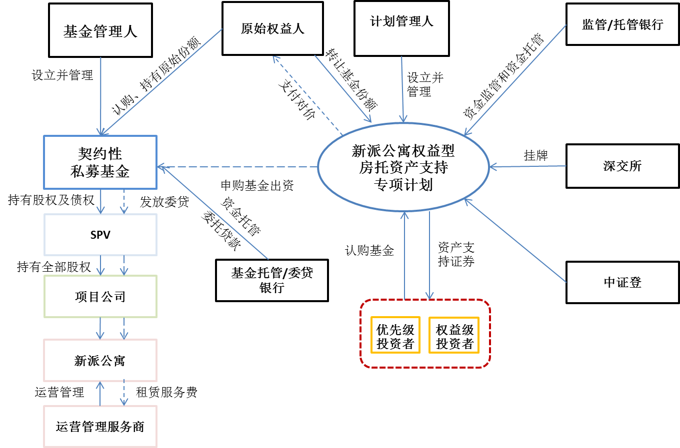 该项目仍然采用了目前权益型类REITs产品的典型结构,即原始权益人设立私募基金,由私募基金直接或间接持有项目公司的股权,同时由私募基金向项目公司或项目公司股东发放委托贷款,项目公司持有标的物业。专项计划发行资产支持证券募集合格投资者的资金,用以收购和持有私募基金份额,进而持有项目公司股权及债权,间接享有标的物业产权。该产品的基础资产为私募基金份额,标的物业经营净收益用以分配资产支持证券投资人预期收益;基础资产的处置所得用以分配投资者本金。