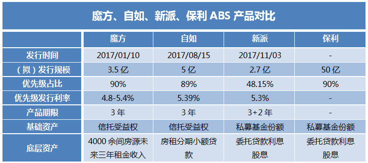 如前文所述,目前,市场上推出[3]了“魔方公寓信托受益权资产支持专项计划”、“中信证券·自如1号房租分期信托受益权资产支持专项计划”、“新派公寓权益型房托资产支持专项计划”以及“中联前海开源-保利地产租赁住房一号资产支持专项计划”四单与长租公寓相关的ABS产品。这四单产品从底层资产、基础资产和发行规模和发行成本、实际融资成本皆有所不同: