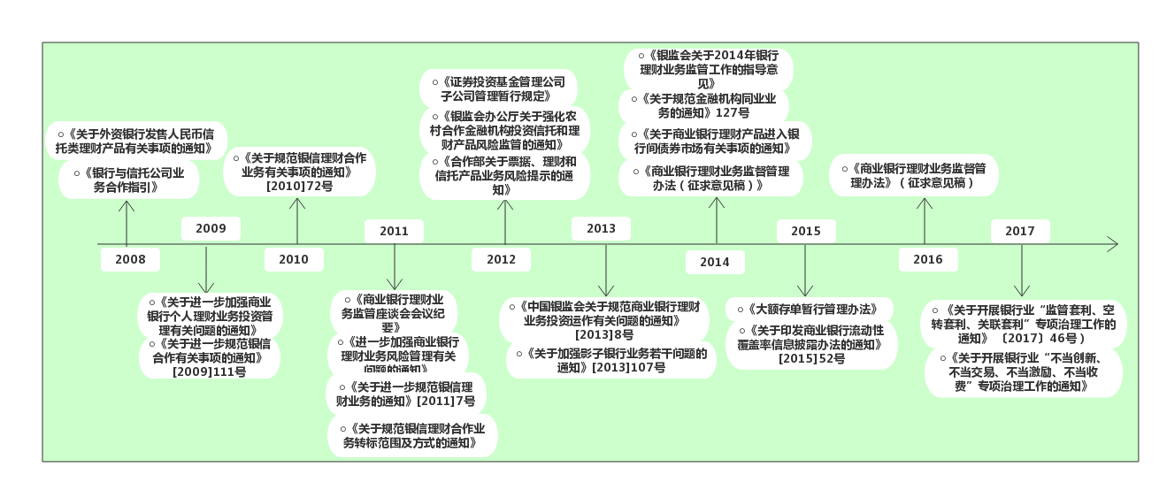 国内商业银行财富管理业务监管基本停留在政策层面,虽然近来监管强化趋势明显,但距离形成完整、统一的监管体系还有较大差距,基本情况大体如下图2.7所示。而且国内目前采用的是分业经营、分业监管体制下的机构监管模式,不同监管部门的监管标准高度不统一,不利于在国内建立统一、有效的投资者保护制度,也不利于建立统一、及时的信息搜集和处理平台。财富管理业务的服务对象是高净值人士,此类客户更看重服务的私密性,在此方面,目前也缺乏必要的法律法规。同时,由于我国的监管重点是维护金融系统的稳定,而导致了刚性兑付的怪象,主要的金融风险由国内商业银行端口承受,对于传统固定收益类理财产品与权益类产品审批条件不一。如果不及时出台监管措施对财富管理业务进行规范,将极易引发整个金融行业巨大的风险。