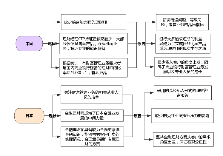 兼具专业性和良好性格的复合型人才是商业银行财富管理业务的最重要一环,因为财富管理业务的专业复杂性,往往需要专业的人才提供服务。日本的商业银行非常关注财富管理业务相关从业人员的培养,而我国则明显不足。具体分析如下图2.6所示。