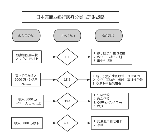 日本商业银行的理财经理往往会根据客户的不同情况与层次进行相应的理财服务推介以及实行针对性的理财方式,通过详尽的市场调查,有效地根据客户资产情况,提供对应的高端优质服务。图2.4介绍了日本某商业银行顾客具体的分类与理财战略。
