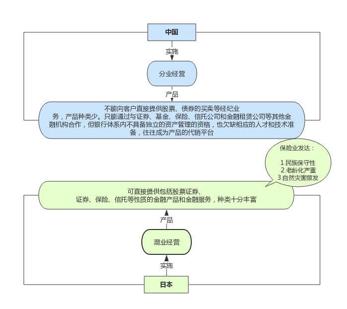 在经营模式方面,我国在1993年之后开始至今一直实行金融分业经营体制,虽然最近有了混业经营的趋势,但并没有上升到政策层面。而在日本,随着金融自由化改革的兴起,日本金融行业的监管制度逐步放宽,分业经营制度调整[1]。日本商业银行开始了银行、信托、证券和保险的混业经营,开展多样化金融服务和自主制定市场竞争性价格。应运而生的财富管理业务被三井住友和瑞穗等几大金融集团以及众多地方银行视为零售业务战略重点和新的效益增长点。具体分析如下图2.1所示。