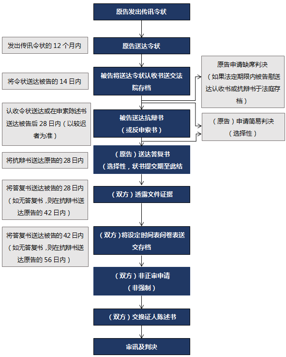 ▪ 诉讼开始时,原告应将载有原告及被告身份和申索性质的传讯令状 (writ of summons) 和申索陈述书 (statement of claim) 送交法院存档以展开诉讼。一经法院发出传讯令状,原告有12 个月时间将该传讯令状送达被告。