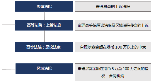 在展开民事诉讼前,原告应先考虑有关申索的性质和所涉及的金额,以决定应该在哪一法院起讼。由于不同法院具有处理不同类型的民事案件之权限,原告须对它们的司法管辖权有基本的认识。处理民事案件的法院包括劳资审裁处、小额钱债审裁处、区域法院和高等法院原讼法庭。劳资审裁处主要解决劳资双方的金钱纠纷,处理因违反《雇佣条例》(香港法例第57章)或 《学徒制度条例》(第47章)而引起的申索。小额钱债审裁处以快速、简单、且花费不多的形式,处理不超过5万元的申索。区域法庭管辖涉及侵权,合同,物权,租金拖欠的案件,侵权与合同的涉案金额最高不超过100万港币的案件。高等法院原讼法庭原则上可审理所有民事事宜,但通常若申索金额不超过100万元的,还是需要在区域法院(而并非高等法院)展开诉讼。