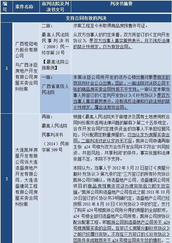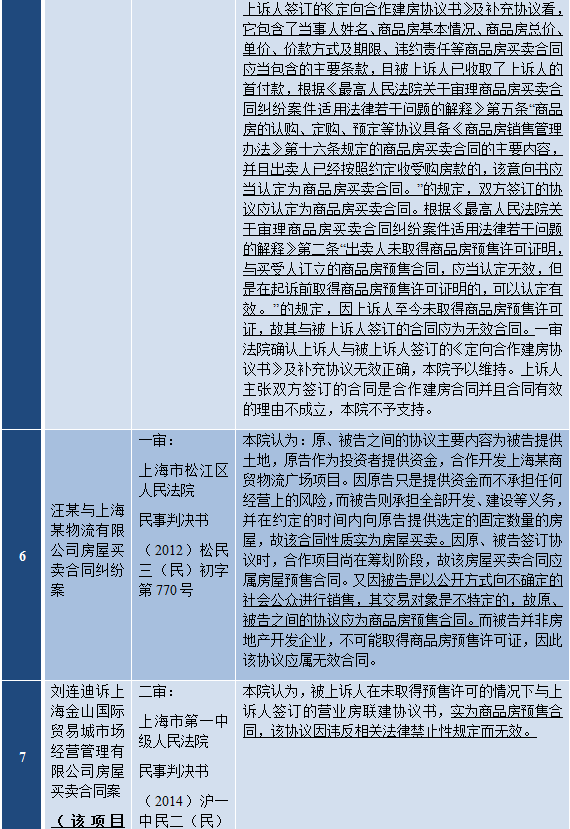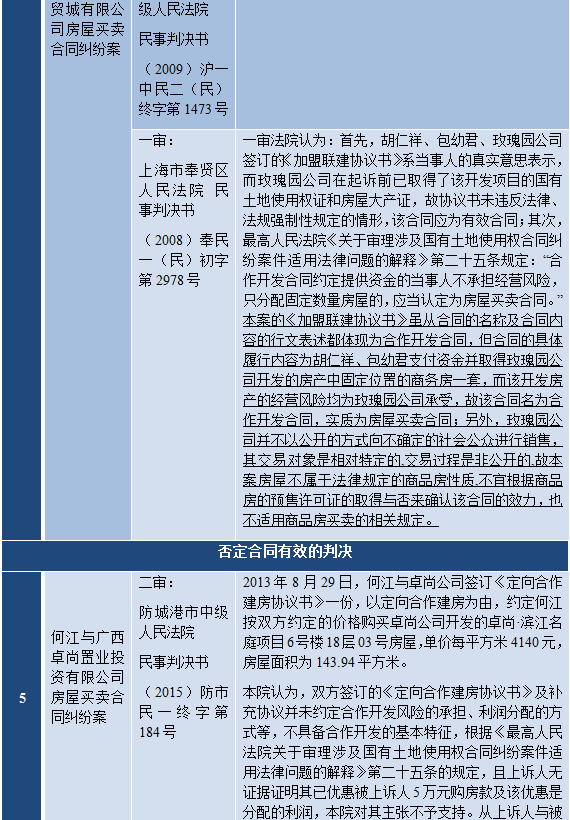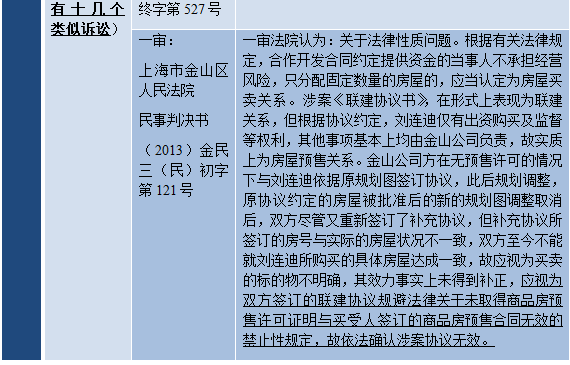 但是也有一些案例中,法院裁判该类合同无效,例如上海金山国际贸易城项目发生了十余起诉讼,该项目开发商在项目不具备销售条件的情况下,与数十个小业主通过签订联建协议的方式销售商品房,法官认为该案中当事人签订的联建协议规避法律关于未取得商品房预售许可证与买受人签订的商品房预售合同无效的禁止性规定,故依法认定合同无效。虽然该案例的判决结果中否定了合同效力,但其实并不矛盾,循其论证思路实质上从反面再次印证了前述观点。