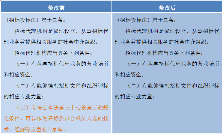 拥有自己的评标专家库,不再作为招标代理机构的必备条件。《招标投标法》第三十七条规定,评标专家由“招标人从国务院有关部门或者省、自治区、直辖市人民政府有关部门提供的专家名册或者招标代理机构的专家库内的相关专业的专家名单中确定”。据此,无论是招标代理机构组建的专家库,还是政府相关部门提供的专家库,都可以用来确定评标专家。所以,是否拥有自己的专家库,不会对招标代理工作产生影响。这一条款的删除,将使那些本来拥有自己专家库的招标代理机构不再拥有“先发优势”或“资源壁垒”,方便了造价咨询单位、项目管理单位等咨询公司进入这一领域。