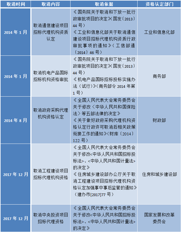 两个文件最重要的内容是全面取消了招标代理机构的资格认定。关于招标代理机构,曾经有五项重要的企业资格,分别为:(1)通信建设项目招标代理机构资质;(2)机电产品国际招标机构资质;(3)政府采购代理机构资格;(4)工程建设项目招标代理机构资格;(5)中央投资项目招标代理资格。取得上述资格是招标代理机构从事相关业务的前提条件。