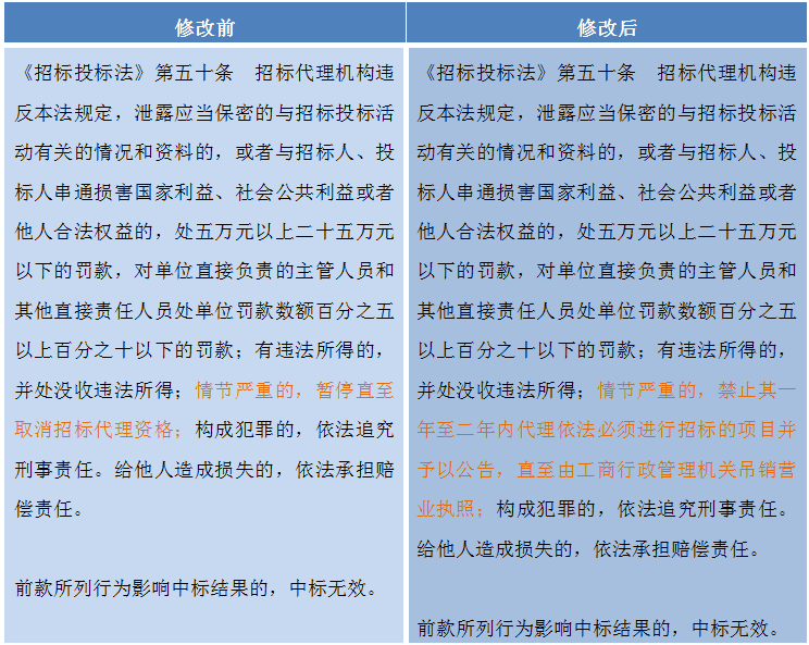 86号令对《招标投标法》的最后一处修改是:“将第五十条第一款中的‘情节严重的,暂停直至取消招标代理资格’修改为‘情节严重的,禁止其一年至二年内代理依法必须进行招标的项目并予以公告,直至由工商行政管理机关吊销营业执照’。”
