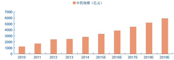 图一:2010年-2019年中药市场规模统计及预测[2]