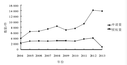 根据我国《专利法》的规定,药品、药品的用途及其制备方法可以通过申请专利获得专利权的保护。[3] 目前,我国中药专利申请呈逐年增长趋势(以2004年至2013年数据为例,见图二),且在申请数量上一直保持较高的水平。但从图二同样可以看出我国中药专利申请在授权率方面呈现下降趋势。[4] 这一方面说明企业的专利意识在不断提高,另一方面却也反映出我国中药专利申请的质量可能并不尽人意。
