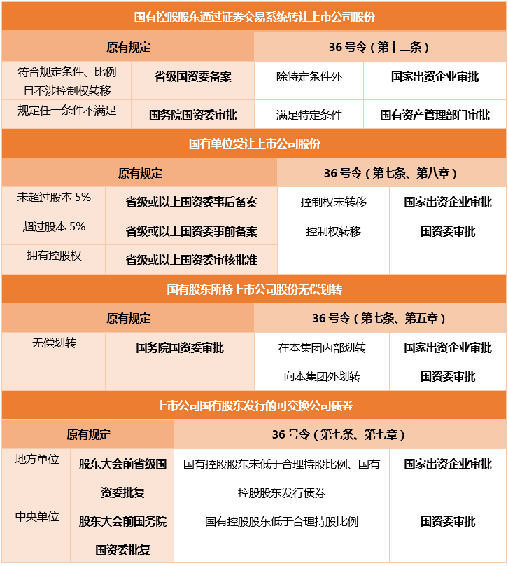 结合本次分级监管变化以及新增授权主体,本文简要对比36号令与原有上市公司国有股权变动规定如下: