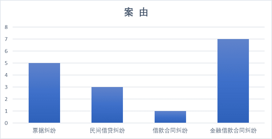 在全部16件案件中,金融借款合同纠纷、票据纠纷、民间借贷纠纷排在前列,分别占比43.75%、31.25%、18.75%,其次是借款纠纷6.25%。
