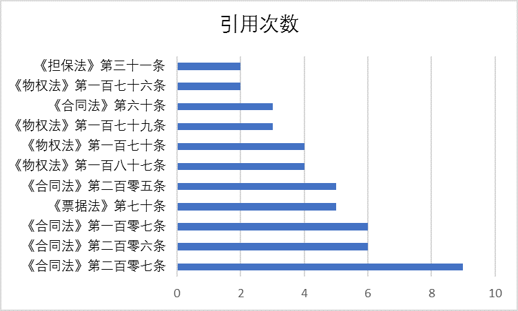 在全部16件案件中,高频使用的实体法集中出现在《合同法》和《物权法》,其中与物权有关的又大量涉及《担保法》的相关法律法规。其中,以《合同法》第207条和206条[1]引用的次数最多。这也从侧面反映了,在借贷活动中,配偶被要求签署《配偶同意函》的情况最普遍。