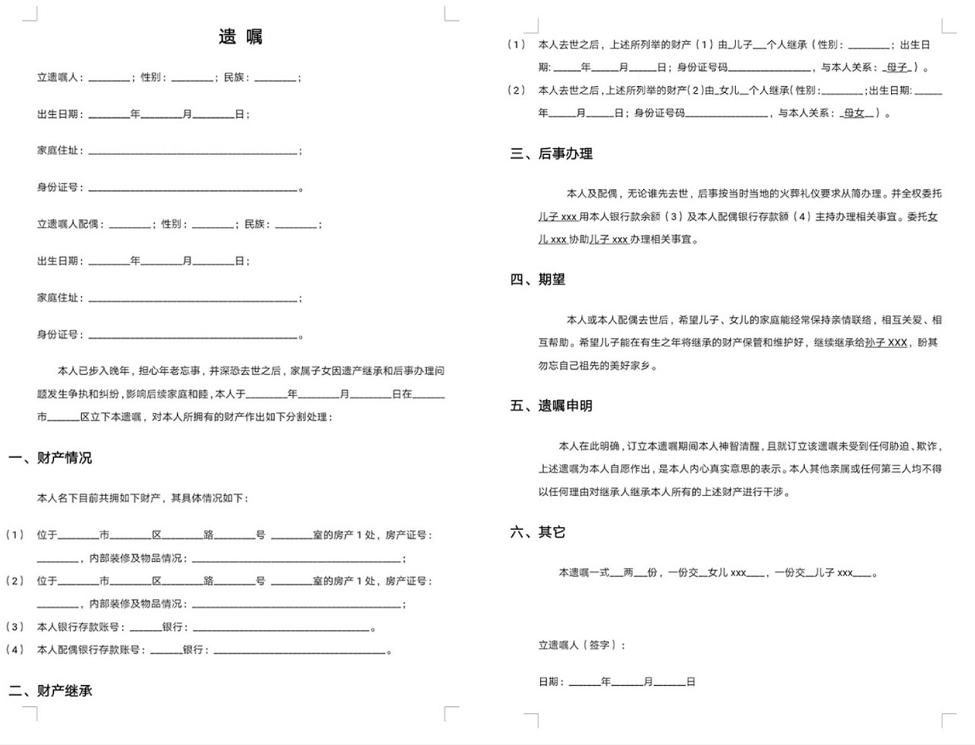 笔者给您推荐一个好方法,立遗嘱。上文已经分析了,要求“奇葩证明”的原因是信息缺失,那么,遗嘱就能够很好的为主管部门提供这些缺失的信息。为什么这么说,笔者以一份简单的遗嘱为您举例说明,请见下图: